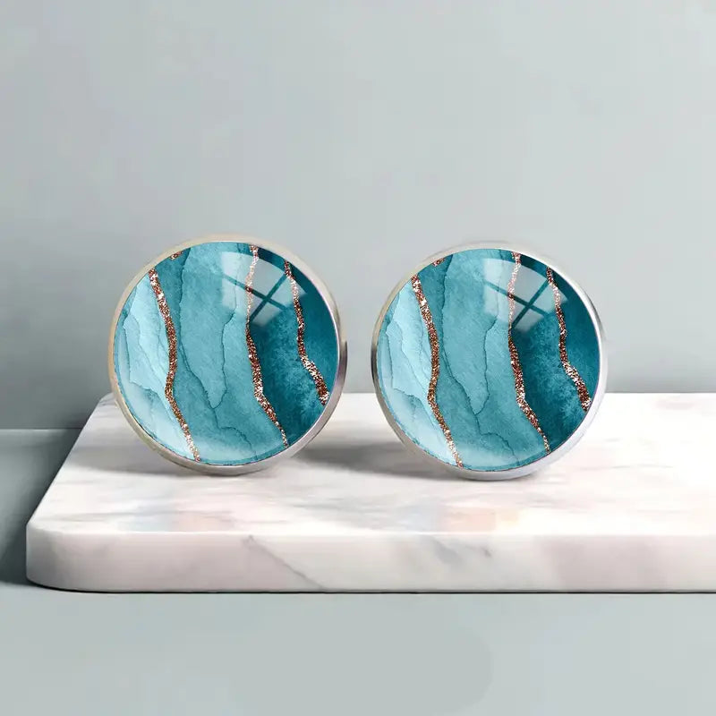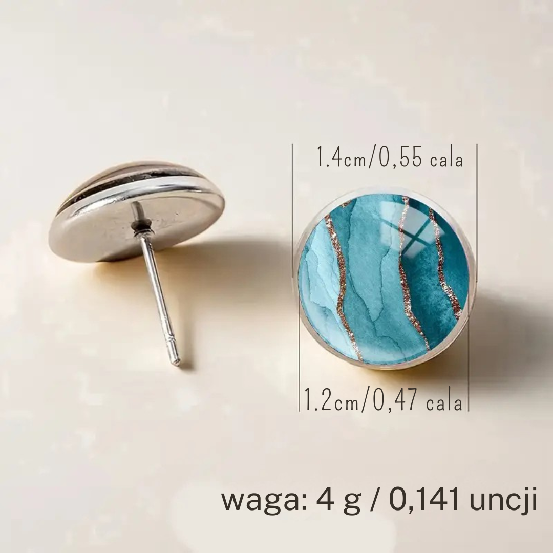 Te nowoczesne kolczyki zachwycają unikalnym wzorem inspirowanym sztuką i naturą. Połączenie turkusowych tonów z połyskującymi liniami w odcieniach złota tworzy efekt głębi i elegancji. To biżuteria, która doda charakteru codziennym stylizacjom i stanie się wyjątkowym akcentem na specjalne okazje.