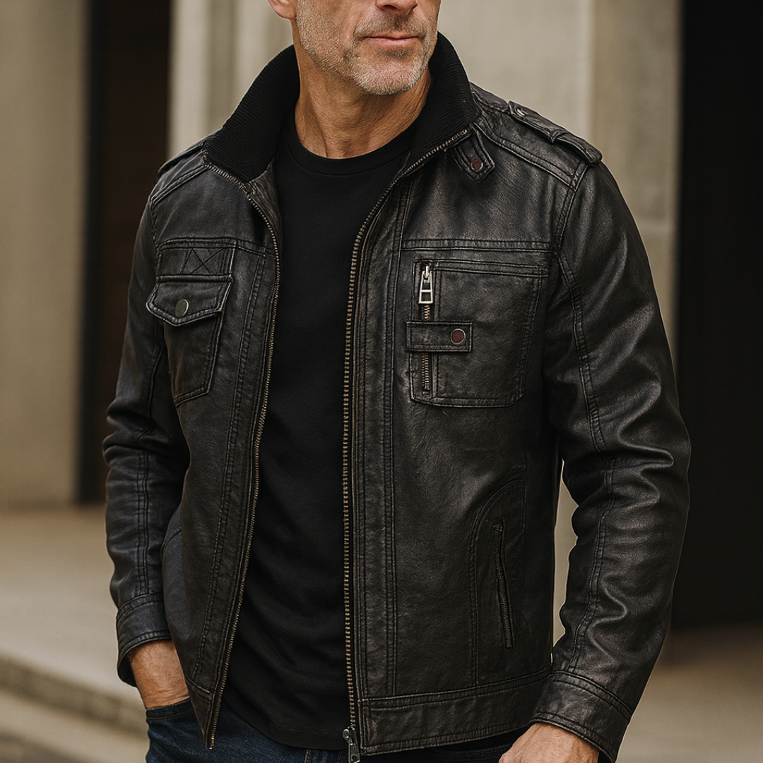 Wykonana z wysokiej jakości materiału imitującego skórę, kurtka łączy w sobie trwałość i komfort, a jej dopasowany krój podkreśla sylwetkę. Detale w postaci przeszyć, zamków i kieszeni nadają jej wyrazisty, męski charakter.