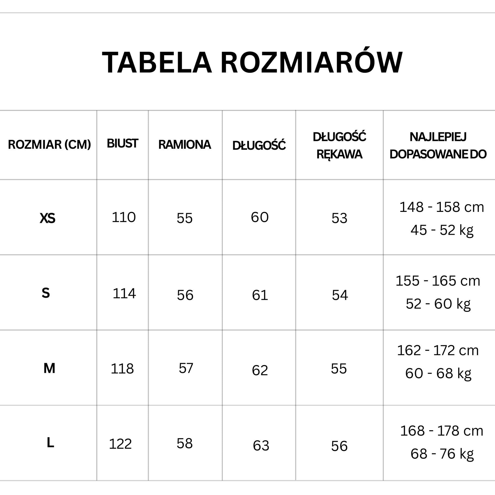 | ROZMIAR (CM) | BIUST | RAMIONA | DŁUGOŚĆ | DŁUGOŚĆ RĘKAWA |