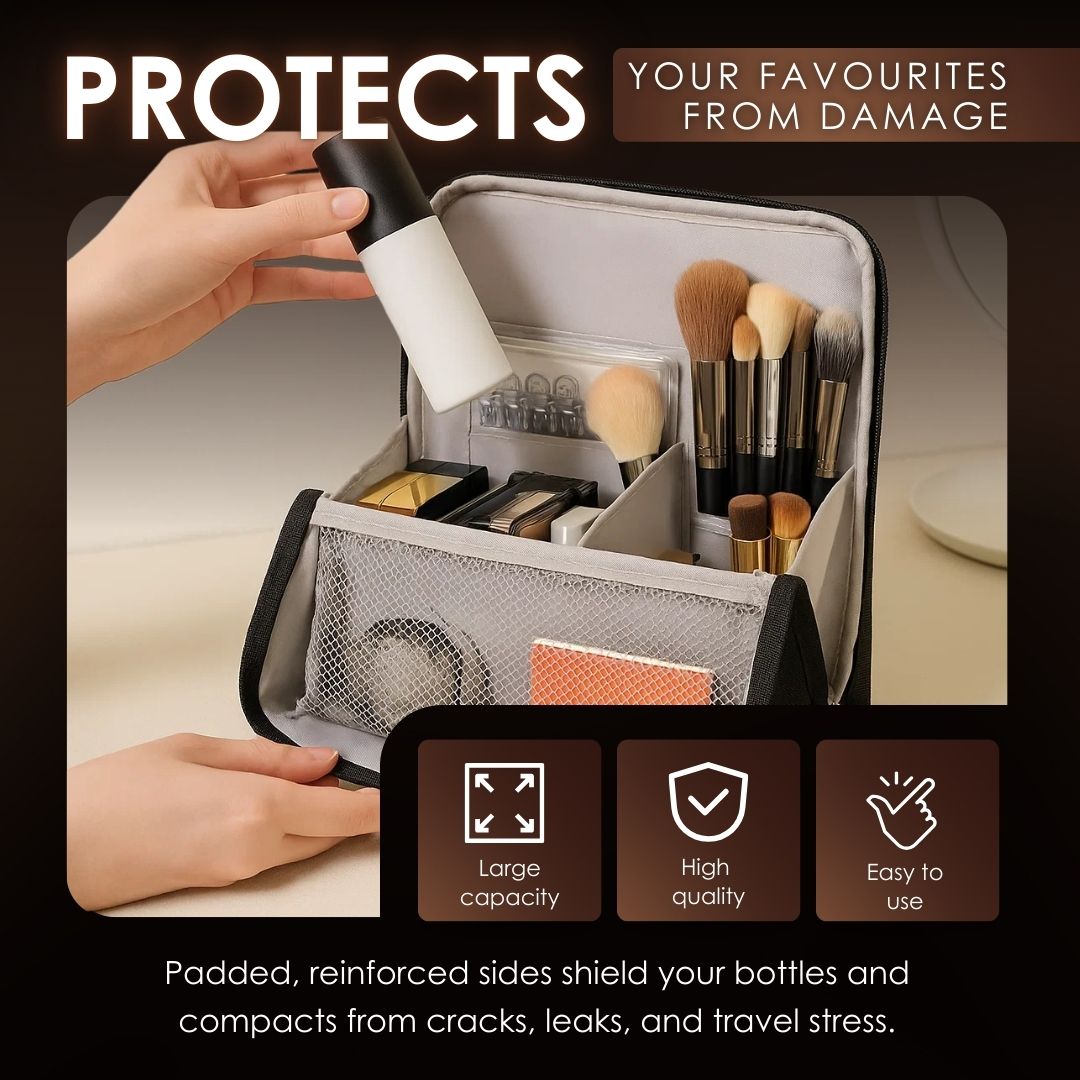 Wyściełane, wzmocnione boki chronią Twoje butelki i kompaktowe kosmetyki przed pęknięciami, wyciekami i wstrząsami podczas podróży.