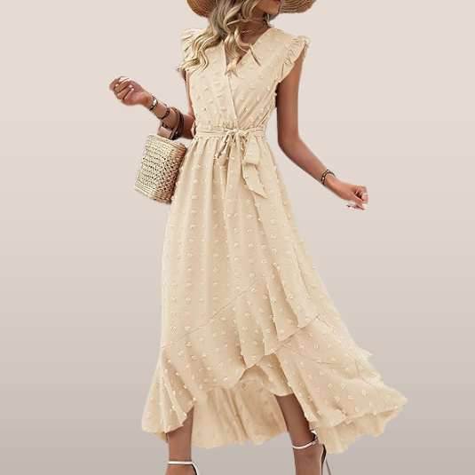 Lekka maxi-sukienka o wyrafinowanej teksturze, z plisowanymi falbanami i kobiecym dekoltem w kształcie V. Pasujący pasek w formie kokardy podkreśla talię, podczas gdy asymetryczna część spódnicy dodaje wdzięku.
