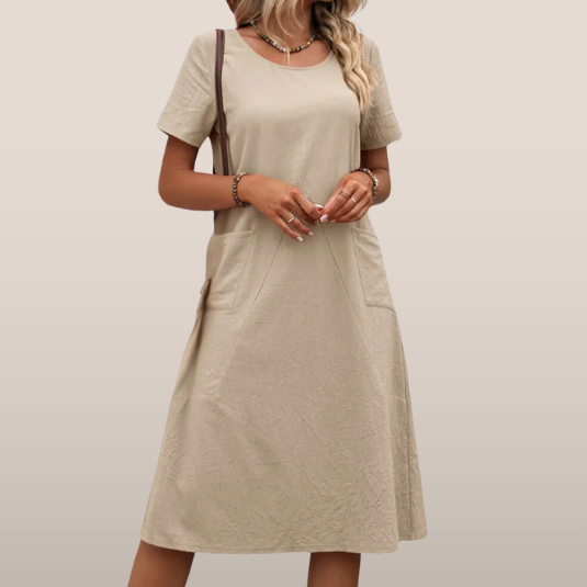 Ta sukienka A-liniowa z krótkim rękawem to wszechstronny element garderoby na co dzień. Subtelne detale i praktyczne kieszenie po obu stronach sprawiają, że projekt jest prosty, ale funkcjonalny. Luźny krój zapewnia swobodę ruchów i lekkość.